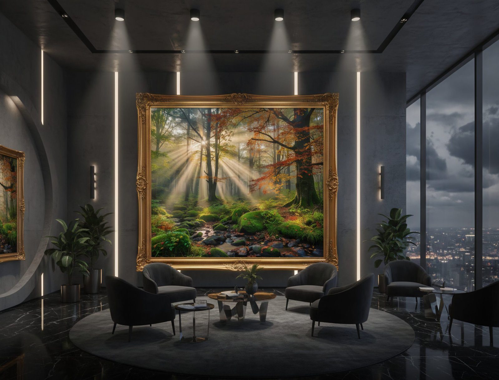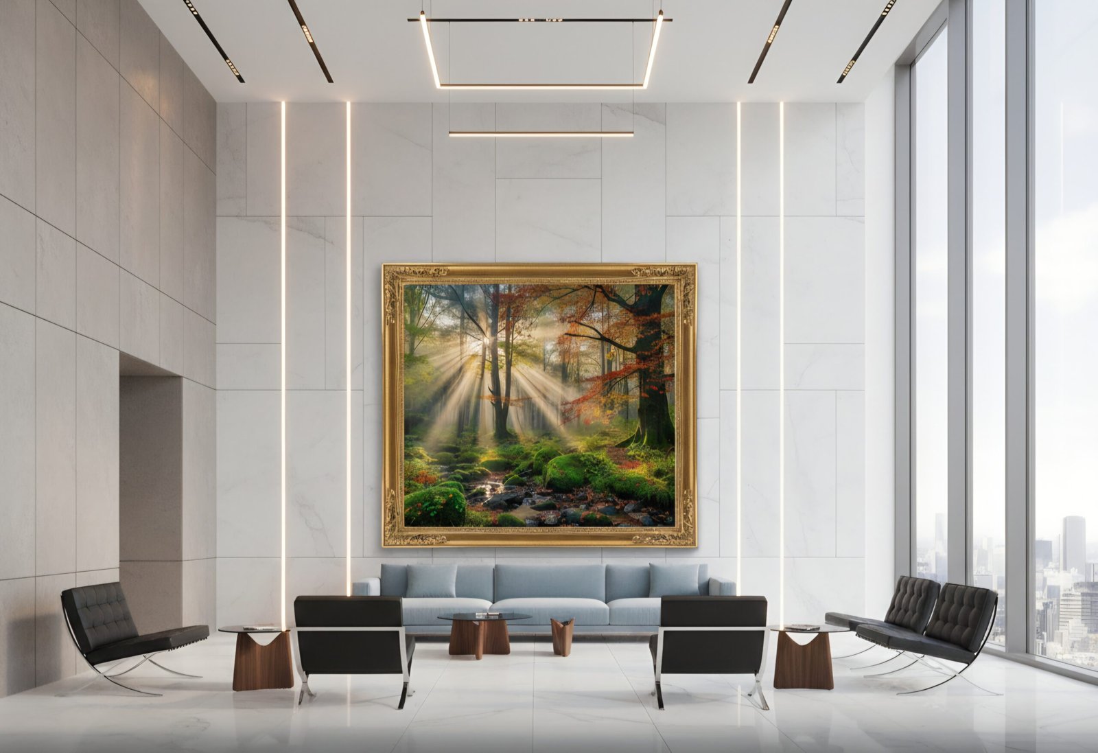 Ein atemberaubendes Waldkunstwerk mit goldenen Sonnenstrahlen, die durch feuchte Morgenluft brechen. Ultra-hochauflösend, detailreich und ideal für erstklassige Großdrucke – perfekt für Wohnzimmer, Büro, Praxisräume oder Studios.