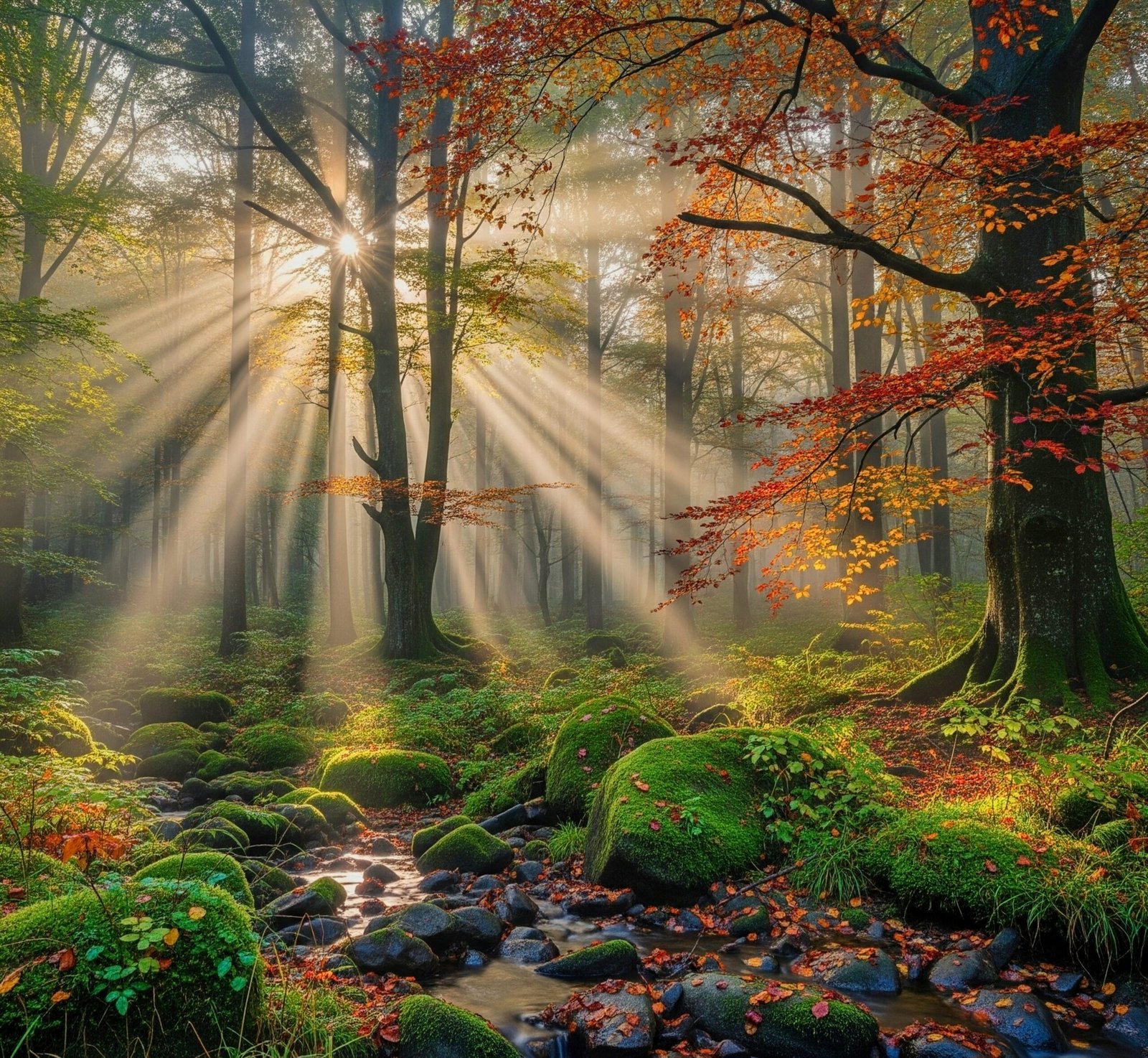 Enchanted Forest Sunrise“ ist ein hochprofessionelles Fine-Art-Motiv, das die Schönheit eines mystischen Waldes im ersten Morgenlicht festhält. Weiches Moos, warmes Herbstlaub und dramatische Lichtstrahlen erschaffen eine Atmosphäre von Ruhe, Kraft und Naturverbundenheit.