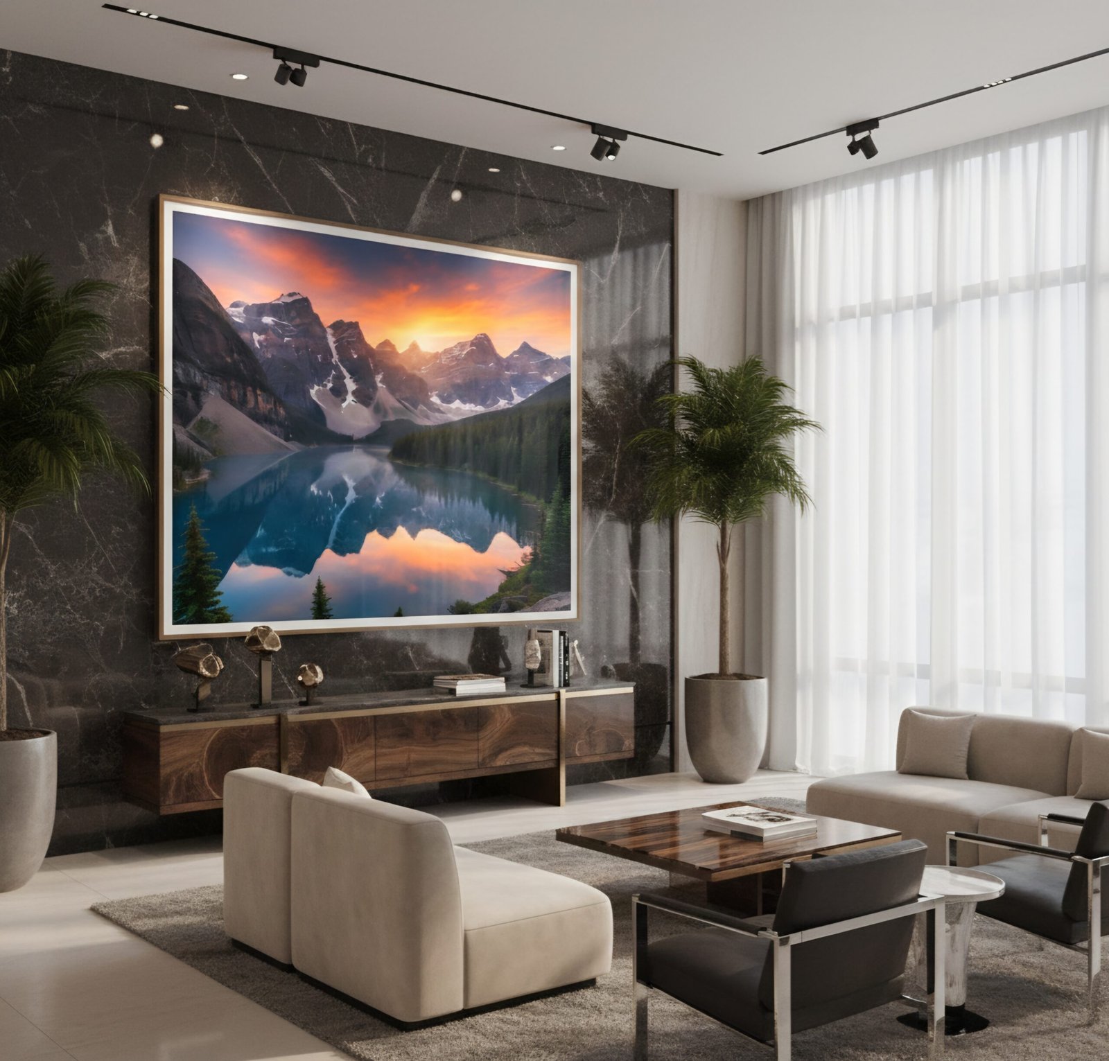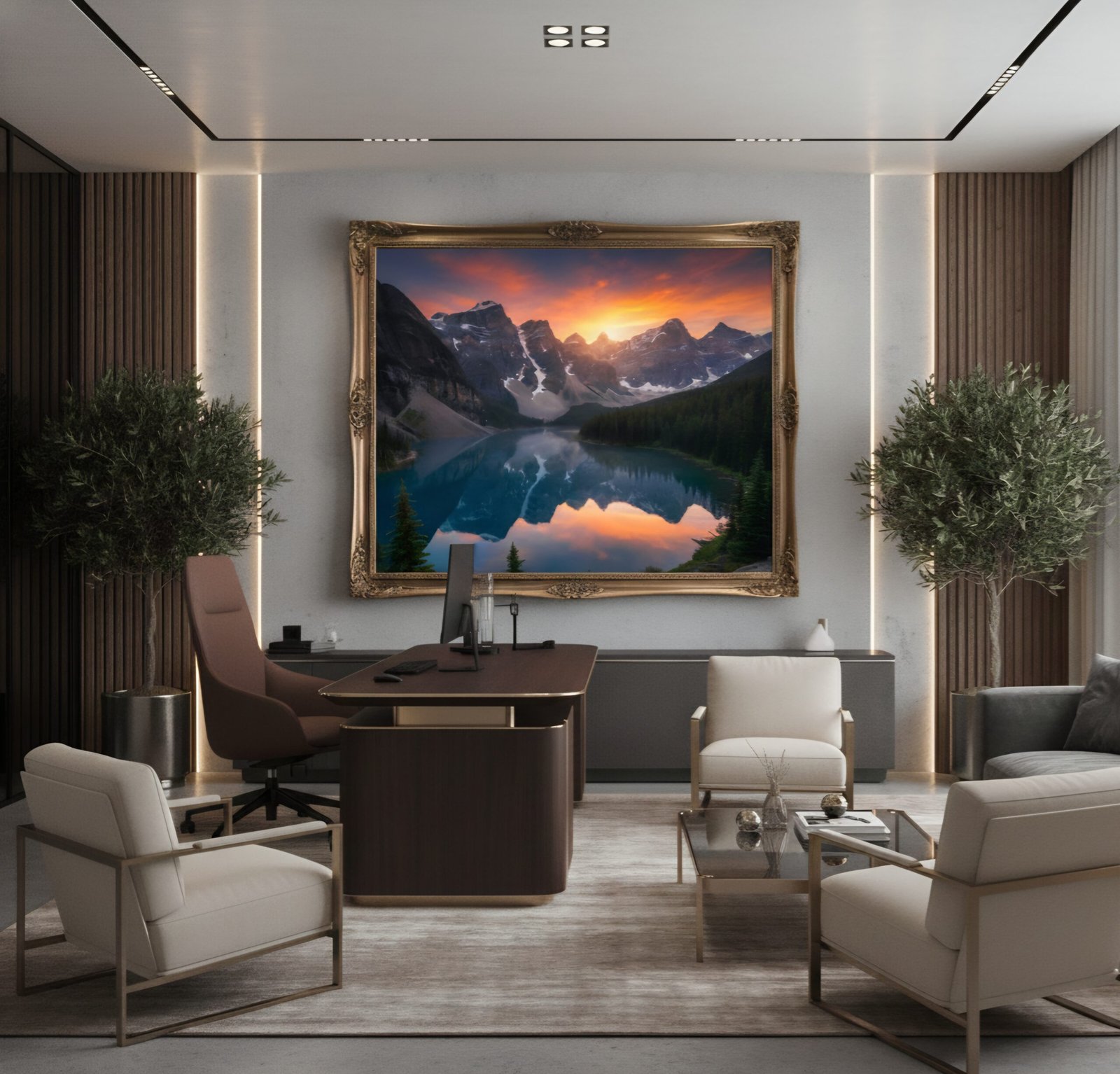 „Aurora Alpine Reflections“ ist ein beeindruckendes Premium-Landschaftskunstwerk mit atemberaubender, realistisch beleuchteter Bergkulisse. Die dramatischen Felsformationen, der glasklare See mit perfekter Spiegelung und der intensive orange-rote Sonnenuntergang schaffen eine majestätische, ruhige und zugleich kraftvolle Atmosphäre. Dieses Werk eignet sich hervorragend für Wohnzimmer, Büros, Empfangsbereiche, Hotels, Chalets, Studios und alle Räume, die ein hochwertiges, naturverbundenes Statement setzen sollen.