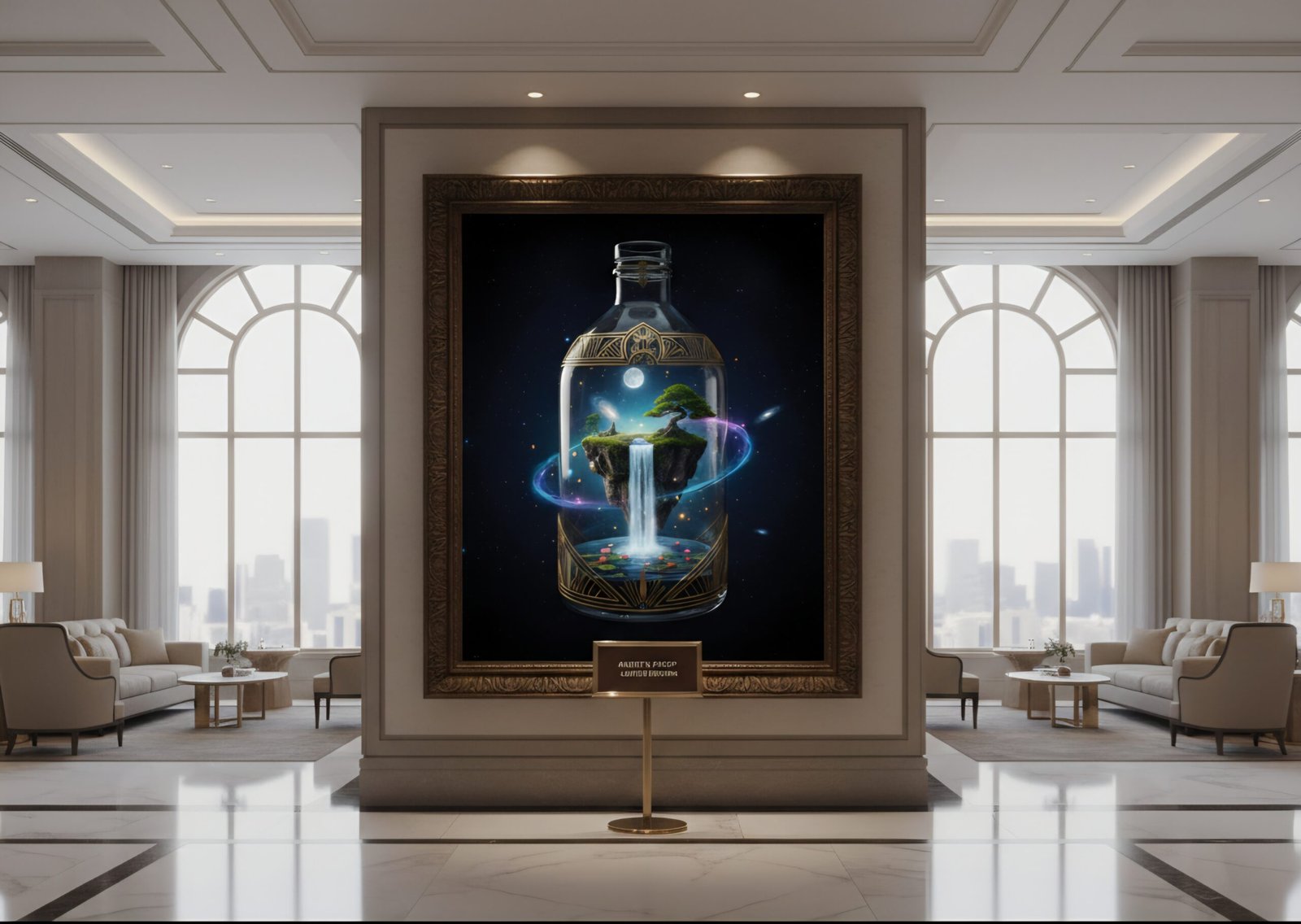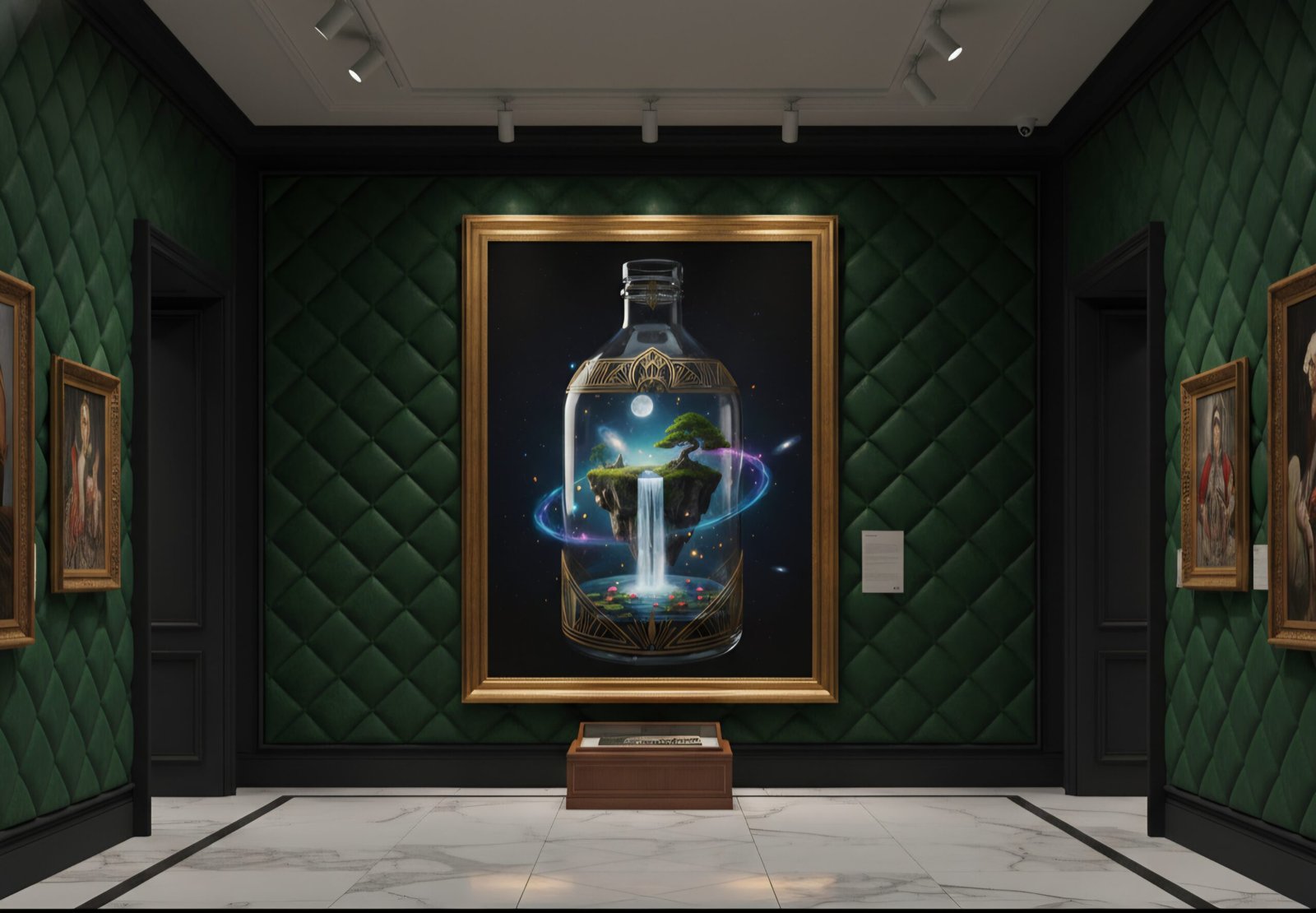 Cosmic Bonsai Realm“ ist ein einzigartiges Fantasy-Artwork, das eine komplette Miniaturwelt in einer kunstvoll verzierten Glasflasche zeigt. Ein schwebender Felsen mit Wasserfall, galaktischer Umgebung, magischer Orbitenergie und leuchtenden Details erschaffen eine faszinierende Kombination aus Natur, Kunst, Magie und Sci-Fi.
