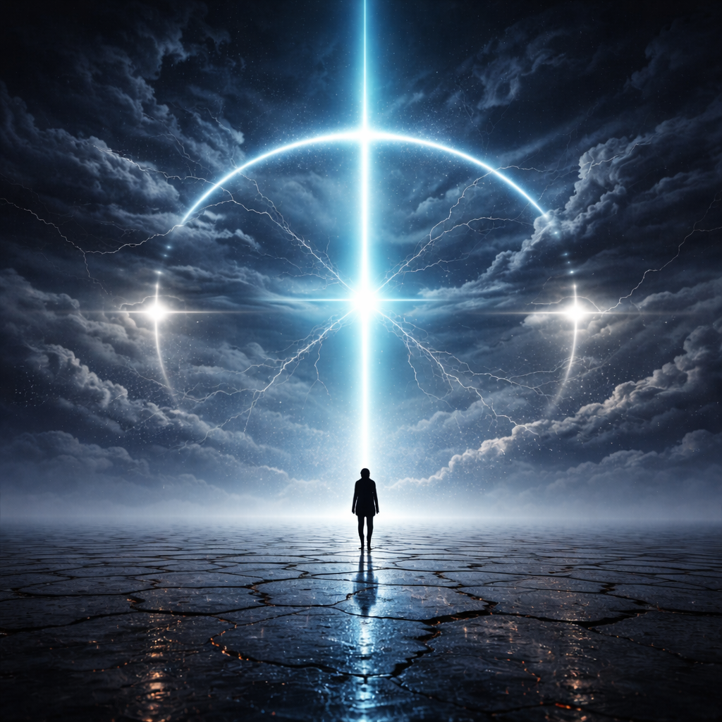 Das futuristische Motiv zeigt eine kosmische Energieachse, die Himmel und Erde verbindet. Eine einzelne Silhouette steht im Zentrum einer gewaltigen Lichtstruktur – Symbol für Transformation, Macht, Spiritualität und musikalische Expansion. Dieses Album Cover Design wurde gezielt für Künstler entwickelt, die ein visuell dominantes und markenstarkes CD Cover suchen.
