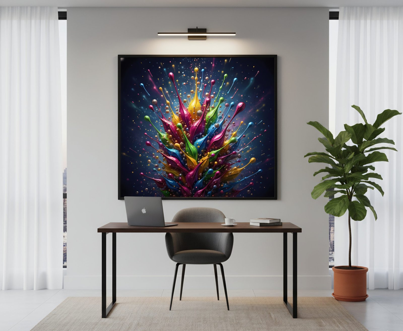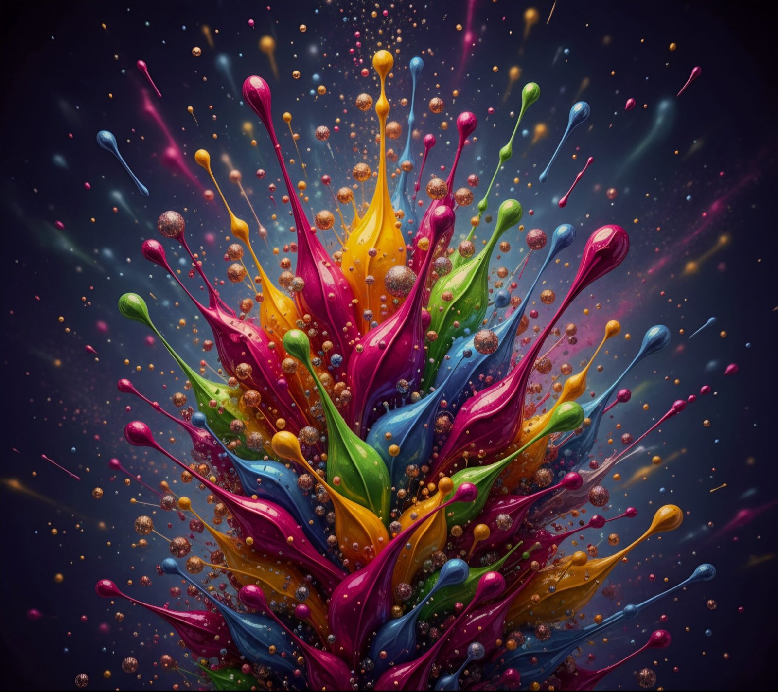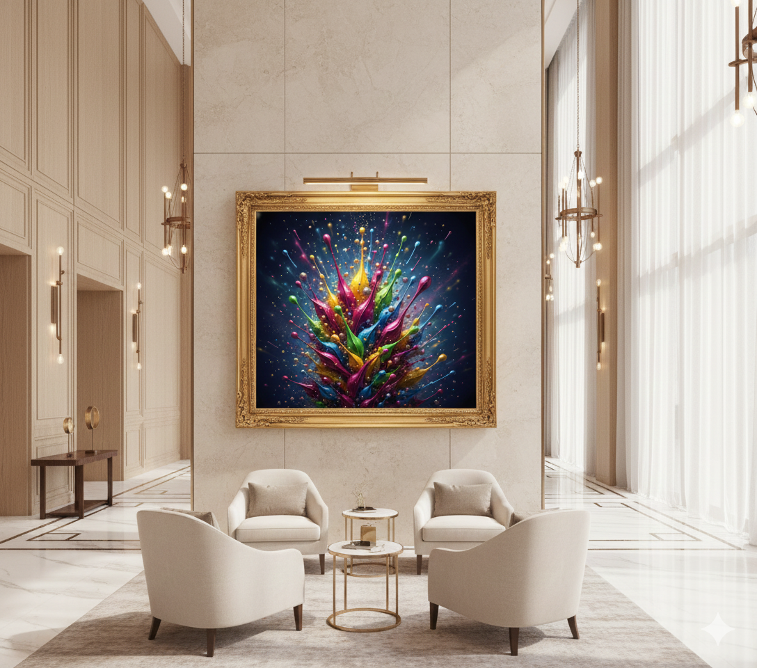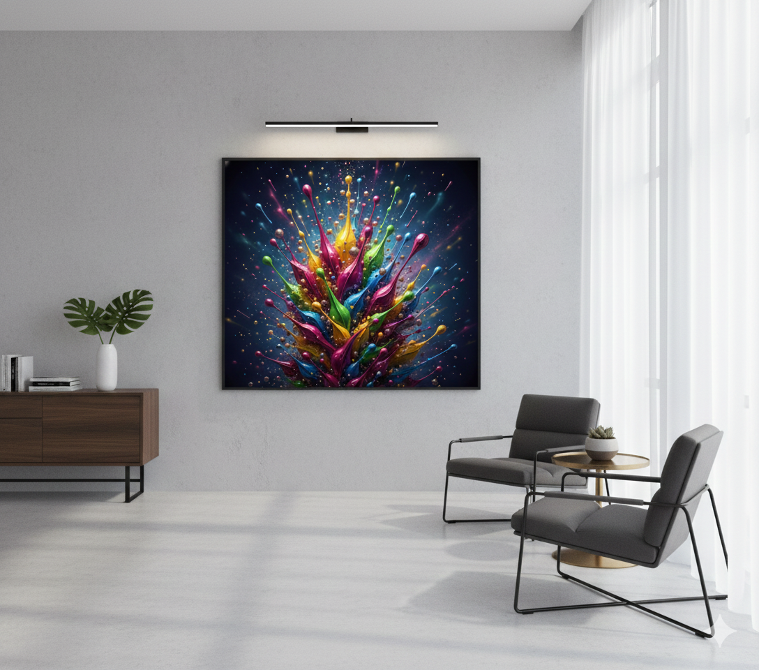 „Chromatic Rise“ ist ein spektakuläres, hochauflösendes Digital-Kunstwerk voller Energie, Farbe und Dynamik. Leuchtende Tropfenstrukturen in kräftigen Gelb-, Pink-, Grün-, Orange- und Blautönen steigen kraftvoll nach oben und erzeugen ein lebendiges, modernes Farbspektakel. Feine Glanzeffekte, Partikel und Lichtakzente verleihen dem Motiv Tiefe und einen kraftvollen 3D-Effekt. Ideal geeignet als farbintensives Wandbild für Wohnräume, Ateliers, Büros oder kreative Arbeitsbereiche.