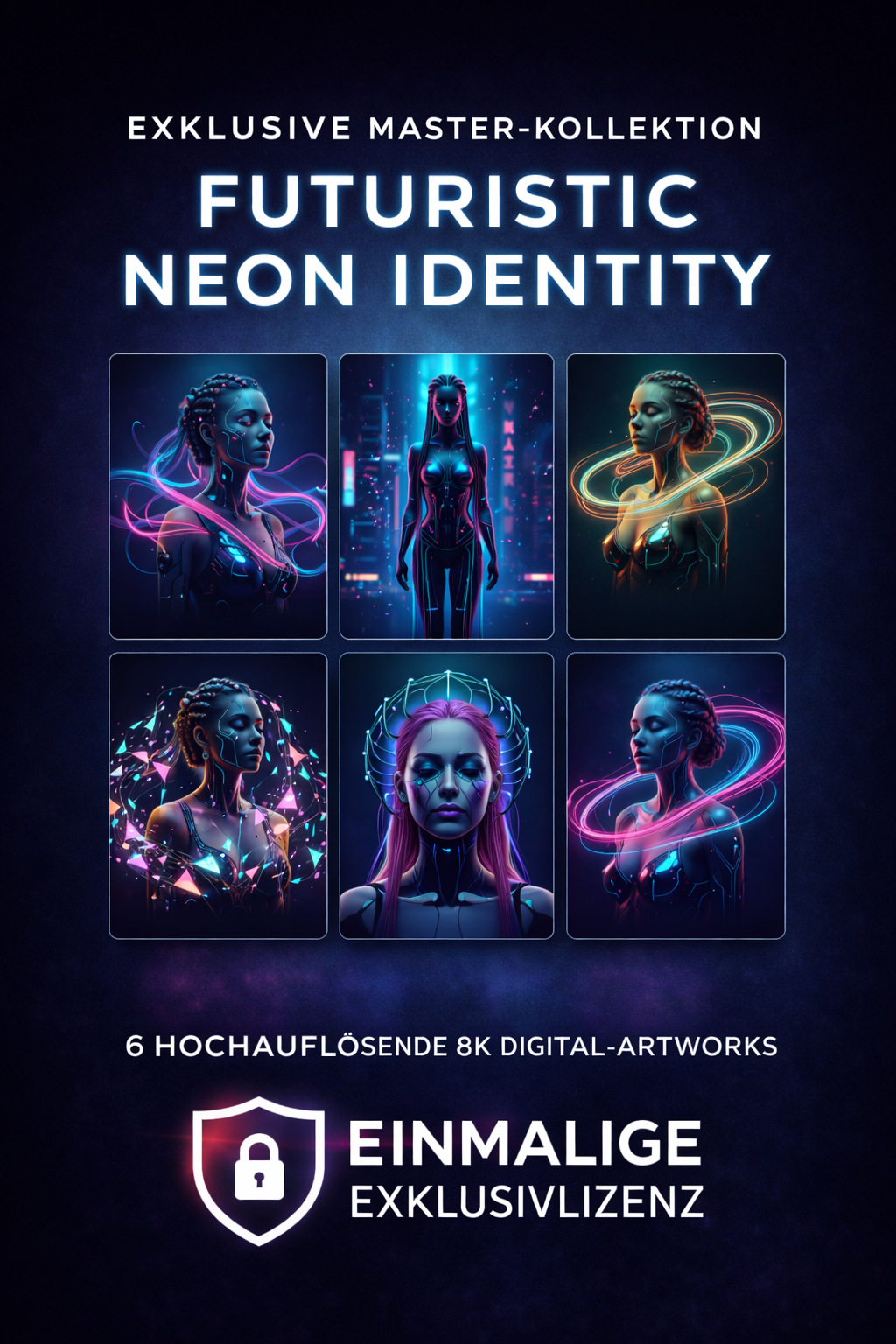 Mit der Kollektion „Futuristic Neon Identity“ erwerben Sie ein hochwertiges Set aus sechs aufeinander abgestimmten, futuristischen Digital-Artworks in maximaler Auflösung.