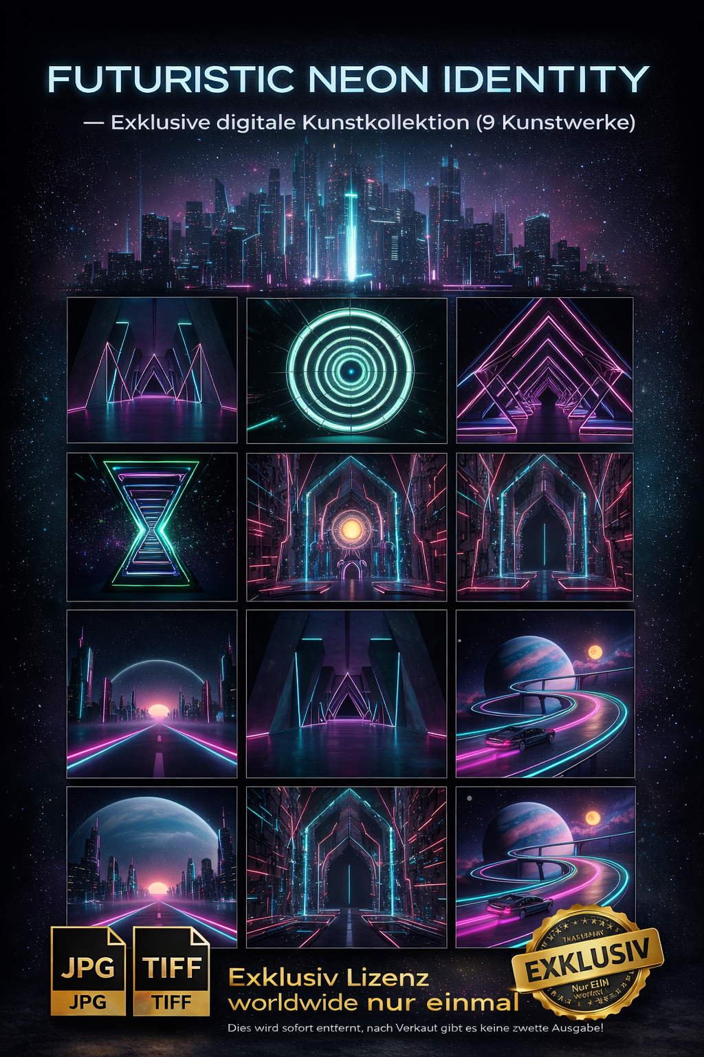 Mit der Kollektion „Futuristic Neon Identity“ erwerben Sie ein hochwertiges Set aus neun aufeinander abgestimmten, futuristischen Digital-Artworks in maximaler Auflösung.