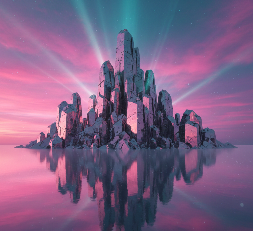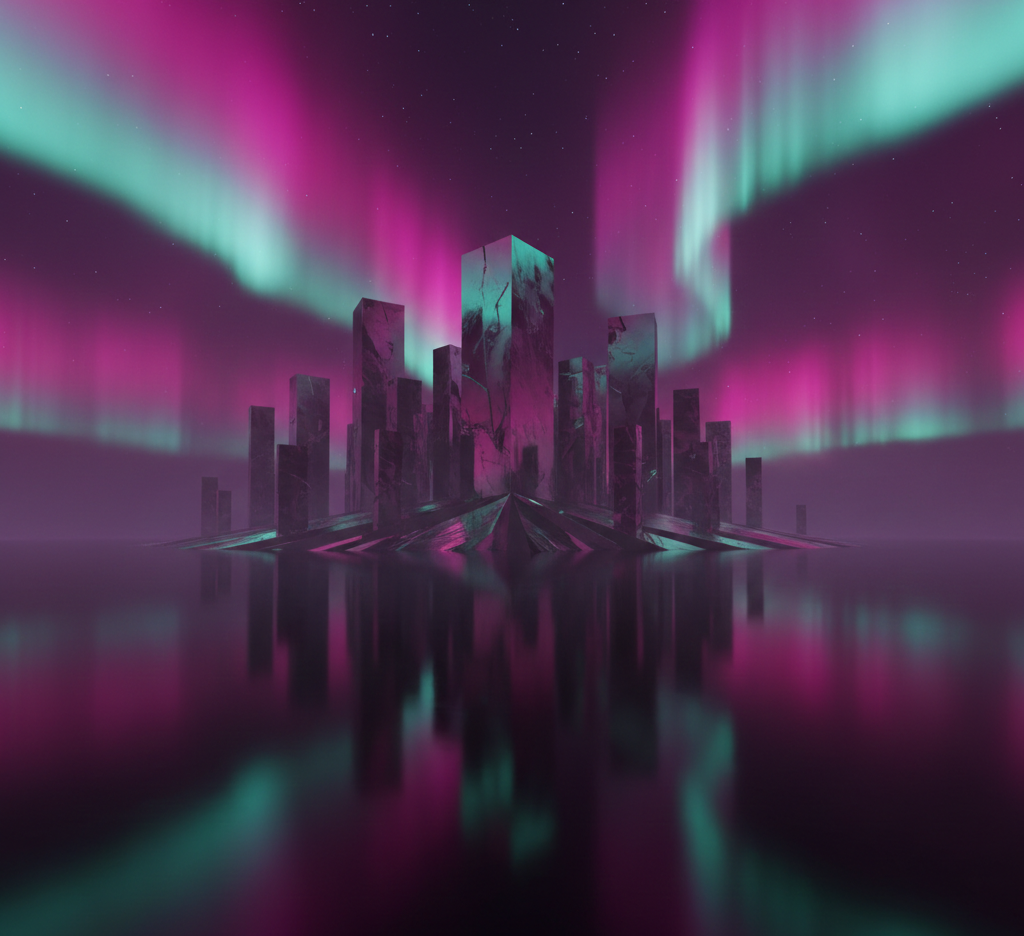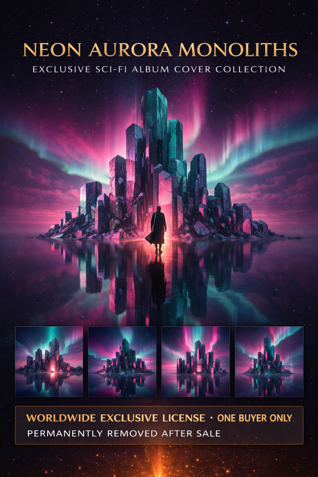Neon Aurora Monoliths ist eine kuratierte Kollektion aus vier cineastischen Sci-Fi-Albumcover-Artworks mit futuristischen Monolith-Strukturen, beleuchtet von intensiven Neon-Aurora-Himmeln und spiegelnden Umgebungen.